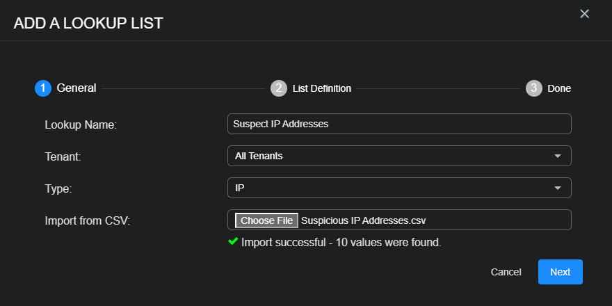 This lookups feature (System | Saved Objects | Lookups) allows you to centrally create and manage lists of IP addresses, text strings, dates, or numbers for conditional matching in queries and alert filters that you create and edit in any of the query and alert filter builder tools such as: