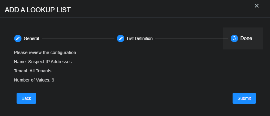 7. Select Next at the bottom of the dialog to advance to the Done page where you can review a summary of your list.