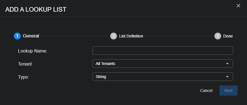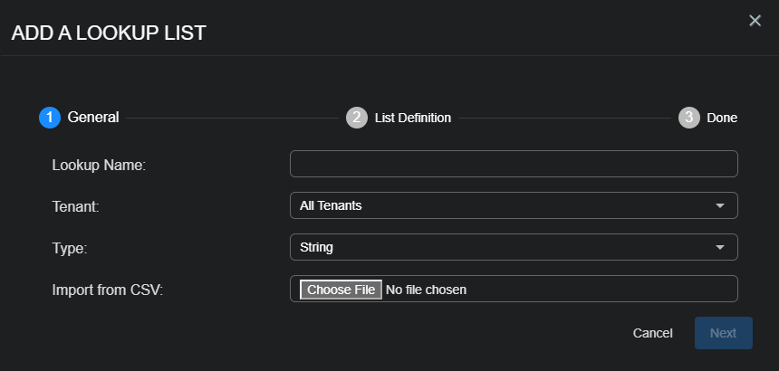 2. On the General page of the dialog box that opens, provide a unique list Name for display in the Query Builder Value menu when the Operator is either is in lookup or is not in lookup.