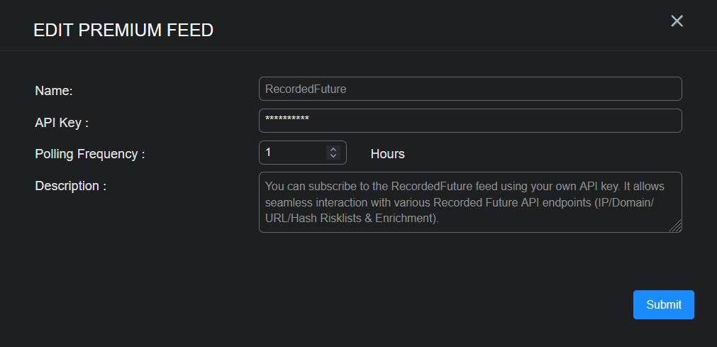 You can subscribe to the Recorded Future feed using your own API key. It allows seamless interaction with various Recorded Future API endpoints (IP/Domain/URL/Hash Risklists & Enrichment). |