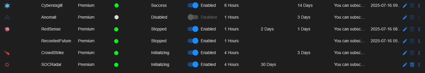 Premium feeds (Cybersixgill, Anomali ThreatStream, RedSense, Recorded Future, SOCRadar, and CrowdStrike) are provided by Stellar Cyber using credentials that you purchase (see Enabling Premium Feeds)