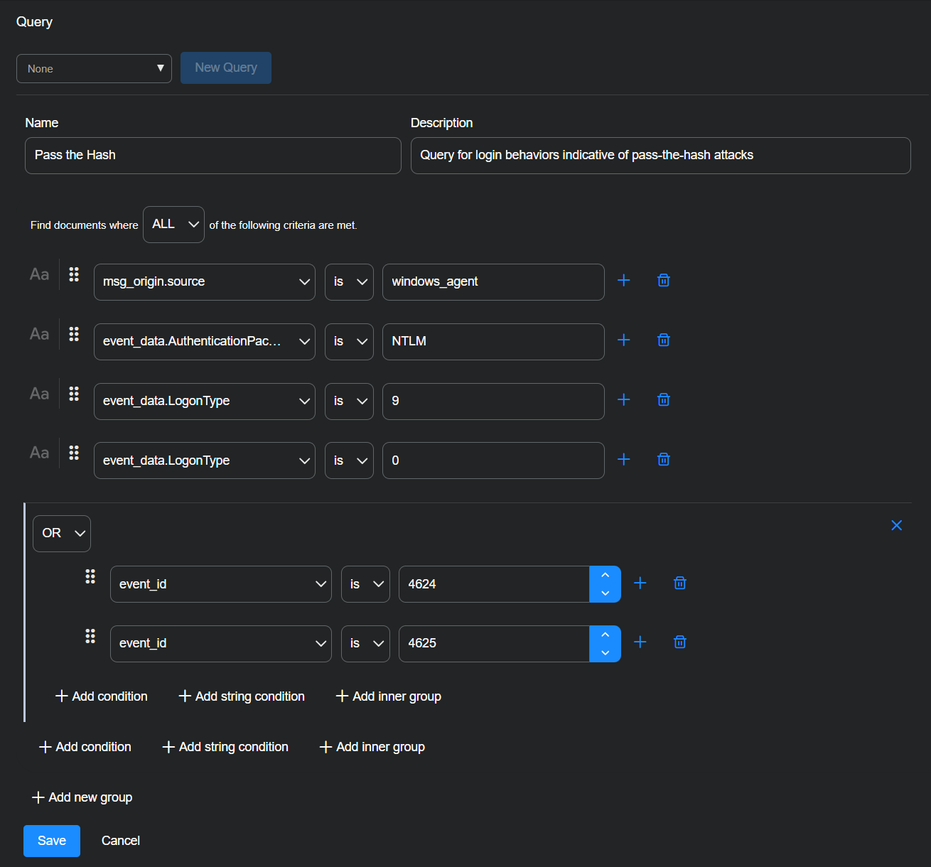 Create an Automated Threat Hunting (ATH) playbook that detects potential pass-the-hash attacks in your environment. A pass-the-hash attack allows an adversary to authenticate using hashed credentials without needing the plaintext password. Detecting this activity helps identify lateral movement attempts within your network. This playbook queries authentication events that match known pass-the-hash patterns and alerts you when a match occurs.