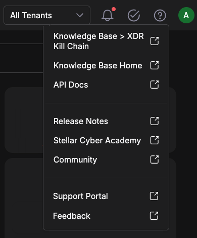 Select the question mark icon in the top-right menu bar to open the Help menu. From here, you can access context-sensitive Knowledge Base topics, the Knowledge Base home page, API documentation, release notes, the Stellar Cyber Academy, community discussions, the Support Portal, and a form for leaving product feedback.