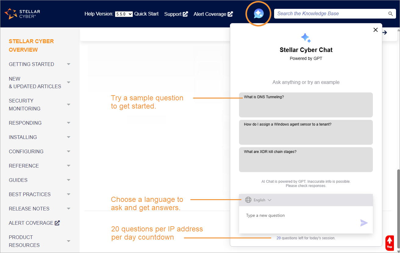 Keep in mind that you are limited to a maximum of 20 questions to Stellar Cyber Chat per day, per IP address. A counter at the bottom of the Stellar Cyber Chat window shows you how many questions you have remaining.