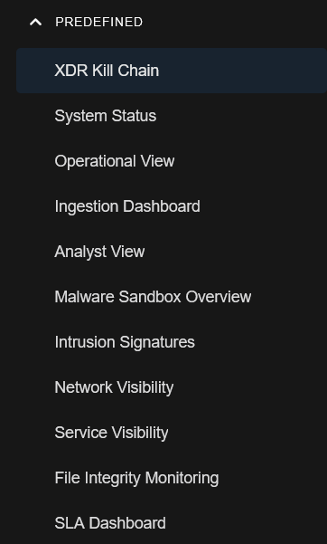 Click the icon to expand the PREDEFINED section of the Dashboards menu to view the menu items: XDR Kill Chain, System Status, Operational View, Ingestion Dashboard, Analyst View, Malware Sandbox Overview, Intrusion Signatures, Network Visibility, Service Visibility, File Integrity Monitoring, and SLA Dashboard.