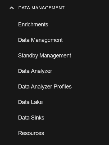 Click the icon to expand the DATA MANAGEMENT section of the System menu to view the menu items: Enrichments, Data Management, Standby Management, Data Analyzer, Data Analyzer Profiles, Data Lake, Data Sinks, and Resources.