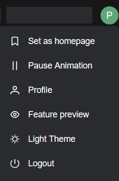 Click the right-most icon to view the menu items: Set/Unset as homepage, Pause Animation, Profile, Feature Preview, Light/Dark Theme, and Logout. In this example, it is a icon.