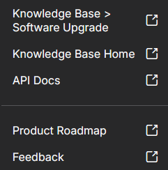 Click the icon to view the menu items: Knowledge Base <specific article>, Knowledge Base Home, API Docs, Product Roadmap, and Feedback.