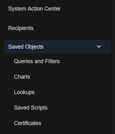 Click the icon to expand Saved Objects to view the menu items: Queries and Filters, Charts, Lookups, Saved Scripts, and Certificates.