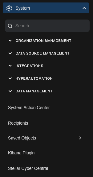 In addition, there are a few menu items at the bottom of the System menu: System Action Center, Recipients, Saved Objects, Kibana Plugin, and Stellar Cyber Central.