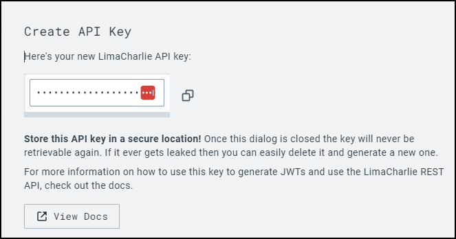 Store the API key in a safe location. It cannot be retrieved later although it can be regenerated.