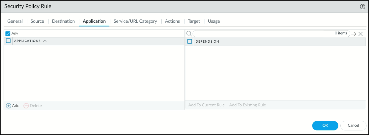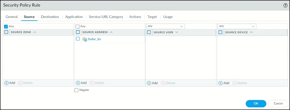4. Under the Source tab, select Any and then add the source address group. In this example, it is Stellar_Src.