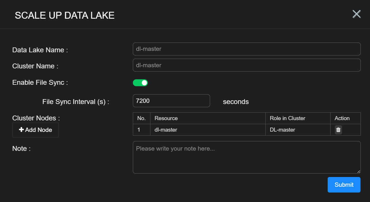• Click the button to display the Scale Up Data Lake dialog box (see below).
