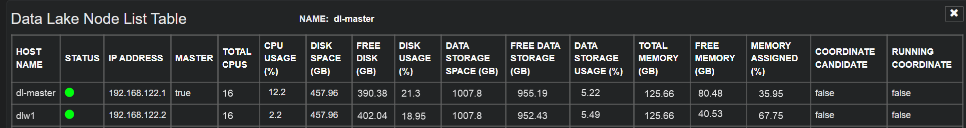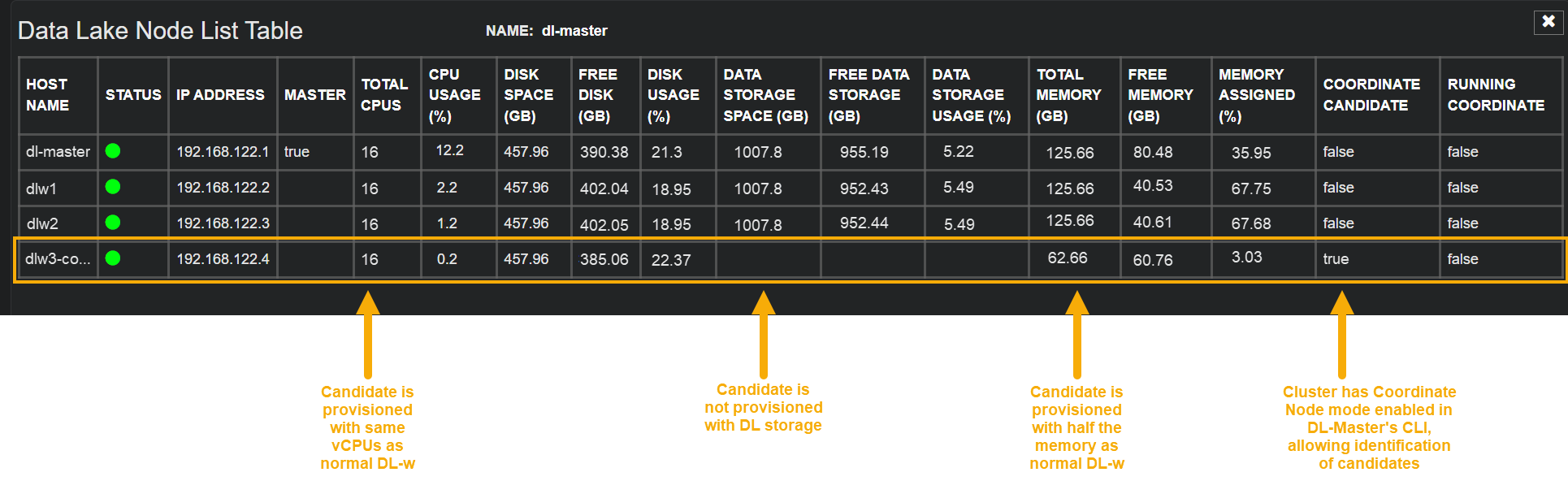 • Running Coordinating Node – Indicates whether the Data Lake includes DL Coordinating Nodes. You can see details on Coordinating Node status in the Node List, as illustrated below. Refer to Scaling Up the Data Lake with Coordinating Nodes for details on working with Coordinating Nodes.