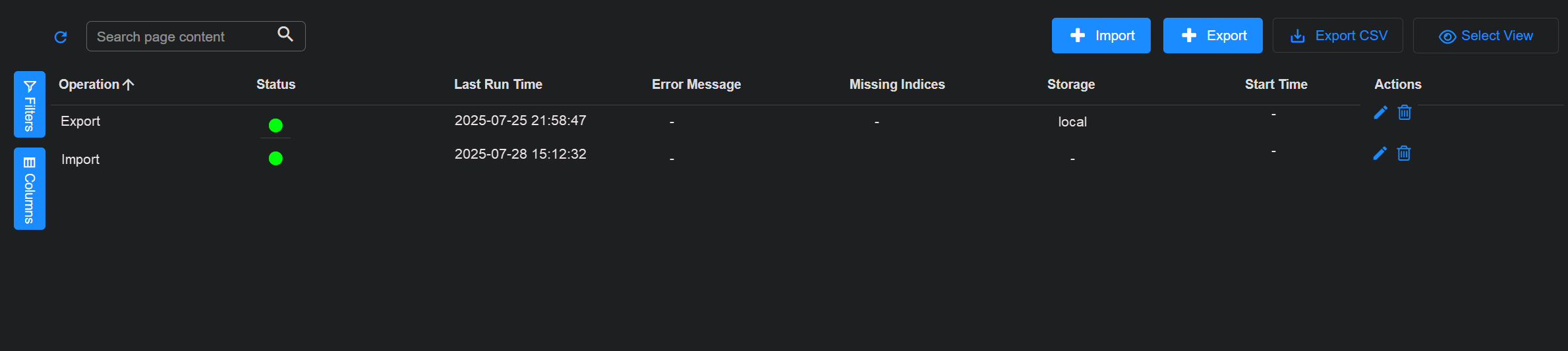 2. Click the Import / Export Indices tab. The existing imports/exports are displayed.
