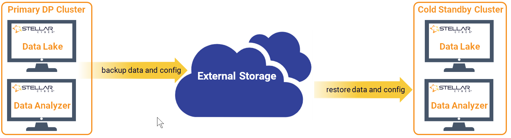 You can also ensure high availability by configuring cold standby on a second appliance. A cold standby is a separate DP cluster that shares external storage with the primary DP cluster for data and configuration backup. If the primary DP cluster goes down, traffic can be directed to the cold standby for continued operation.