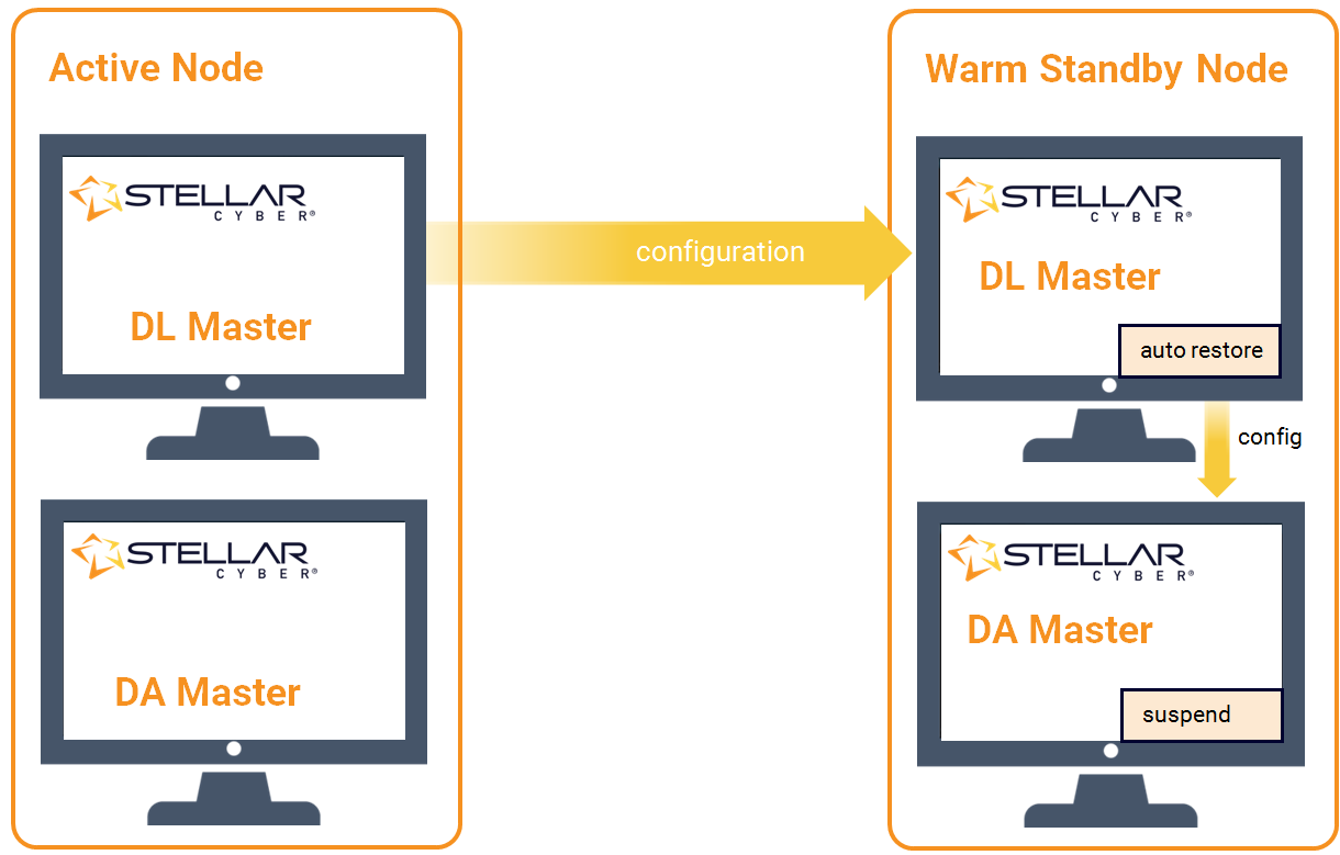 Both the DA and DL clusters can span multiple nodes for scalability and reliability. Stellar Cyber's clustered architecture lends itself to easy configuration of standby servers for both DL and DA nodes, as well as replication of data across nodes in the cluster to ensure high data availability.