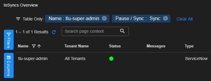 You can create up to three InSyncs. During the configuration, you will authenticate the user with ServiceNow, select the type of integration sync (alerts, cases, or both), and provide the name of a ServiceNow alert database table, case database table, or both.