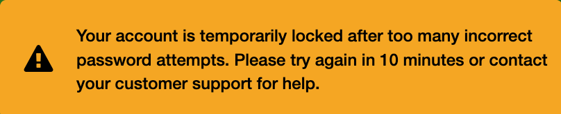 • When a user is locked out, an error message displays. The first time a user is locked out, they can try again in 10 minutes. After a second lockout, the duration is 20 minutes. All future lockout periods for that user are 30 minutes.
