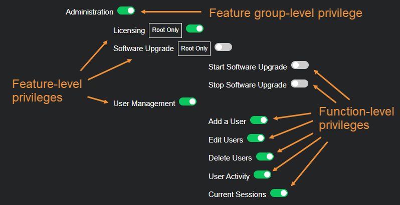 You can define access privileges globally and at the feature group, feature, and function levels. To define privileges, simply toggle privileges on or off.