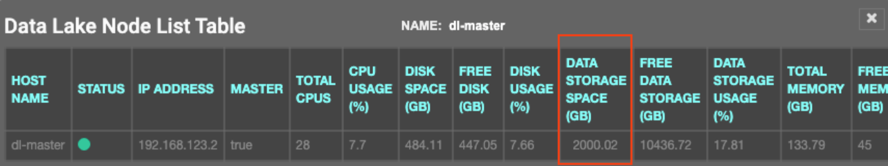 10. Check the Data Storage Space column to verify that the expected capacity is available. For example: