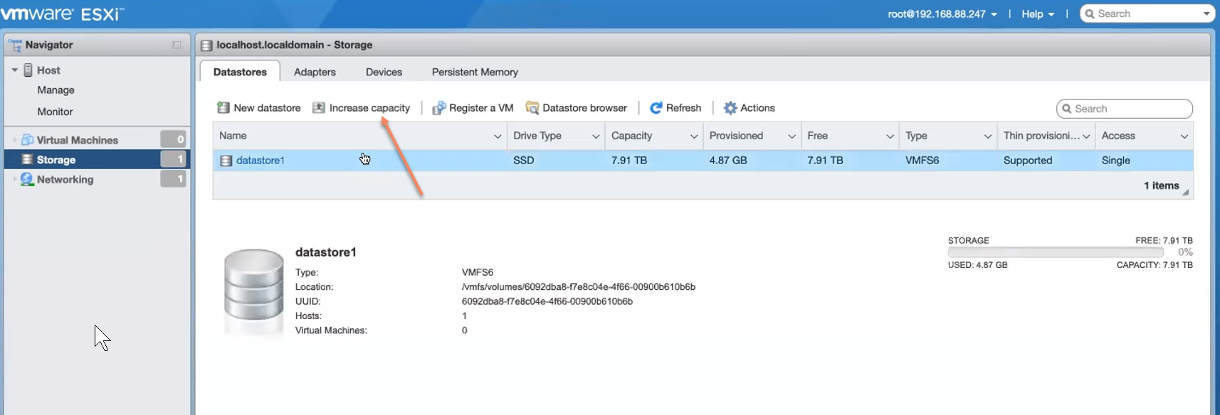 3. Select the entry for the existing datastore and click the Increase capacity button, as shown in the example below.