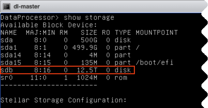 10. Verify that the new storage is available with the show storage command. The example below shows 12.5 TB available on sdb.