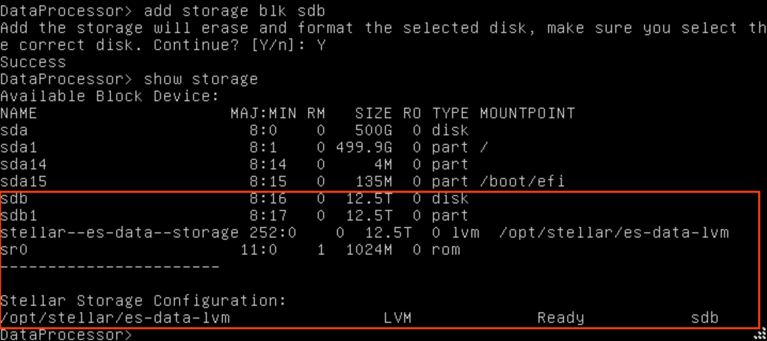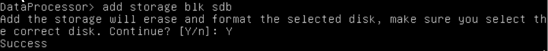 11. Use the add storage blk <bulk storage name> command to add the new disk for use by Elasticsearch. For example, using the sdb disk in our current example: