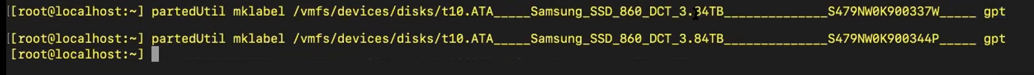 3. Use the partedUtil mklabel <path to disk> gpt command to format the disks with a GPT format.The figure below shows the necessary commands for the current example: