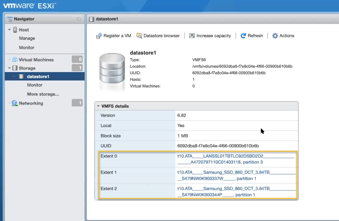 You can verify which physical disks a datastore is using by navigating to the Storage > Datastores tab and clicking the entry for the datastore in the Name column. A screen appears showing the datastore's configuration, including the constituent disks, as highlighted in the example below: