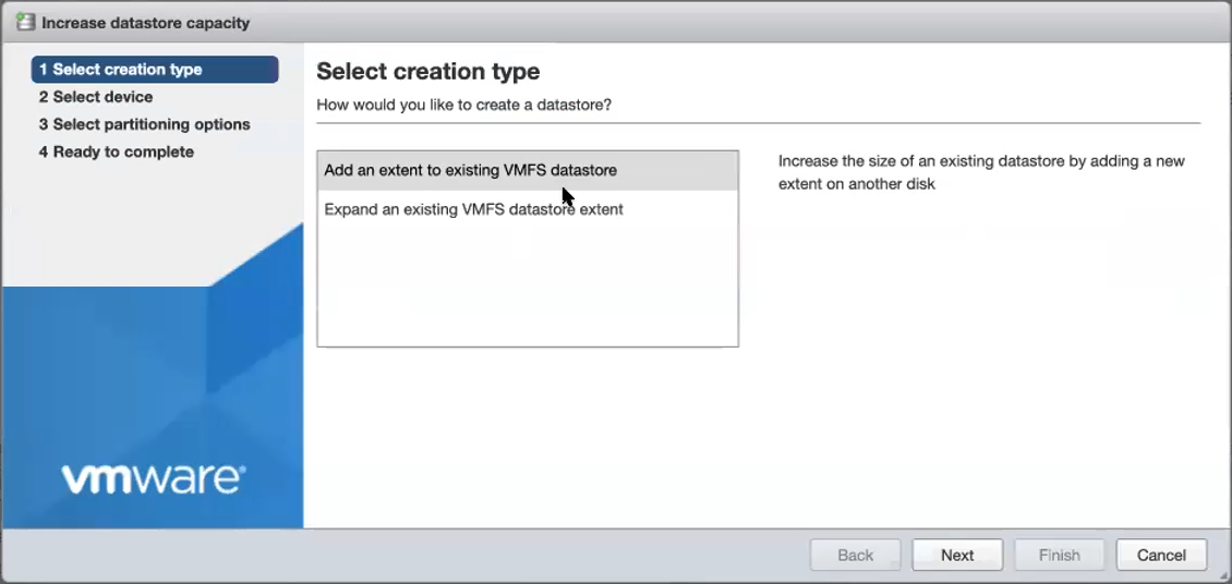 4. In Select creation type, select Add an extent to existing VMFS datastore and click Next.