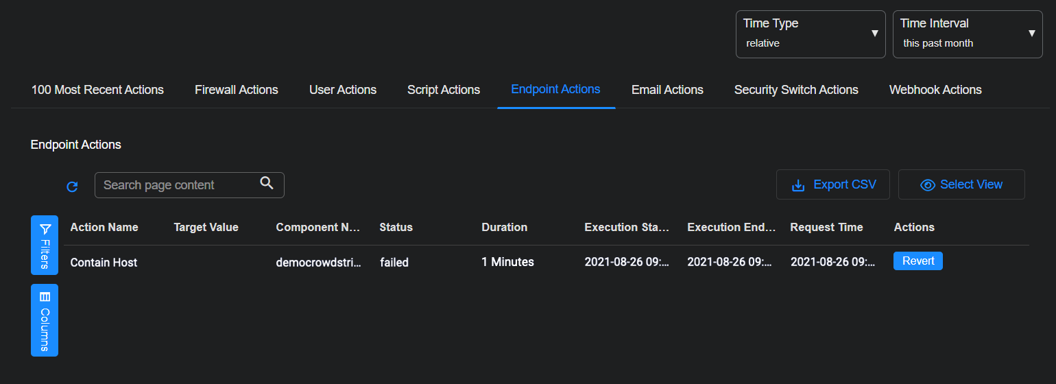 If the host was contained, you can click Revert to lift the containment from a host. This triggers a new endpoint action Lift Containment to appear in the table.