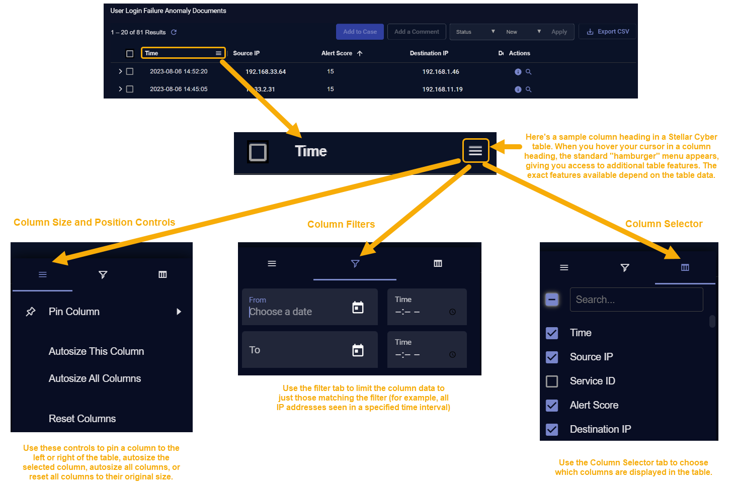 Stellar Cyber tables include a handy set of column controls in each column header. When you hover your cursor over a column heading, the cursor turns into a pointing hand and a "hamburger" menu