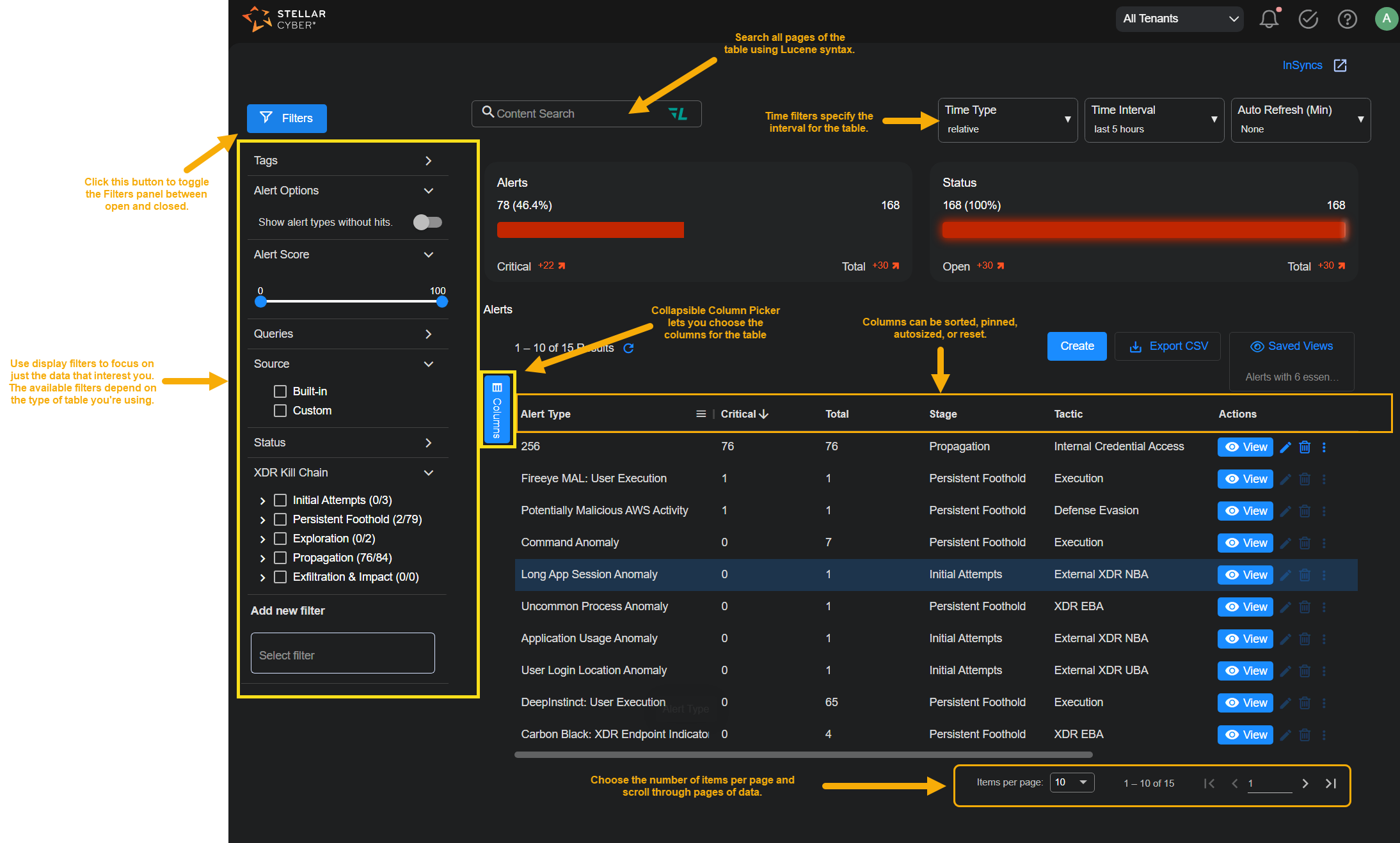 The Saved View Configurations feature lets you preserve and reapply customized table layouts across different sessions and contexts within the Stellar Cyber UI. Rather than reconfiguring columns, filters, and sorting options each time you revisit a page, you can save your preferred setup as a view and reload it instantly when needed.