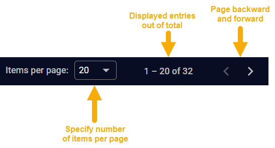 Tables in Stellar Cyber include standard controls to move between multiple pages of data. As illustrated in the figure below, you can use the following tools to speed your way through multiple pages of data: