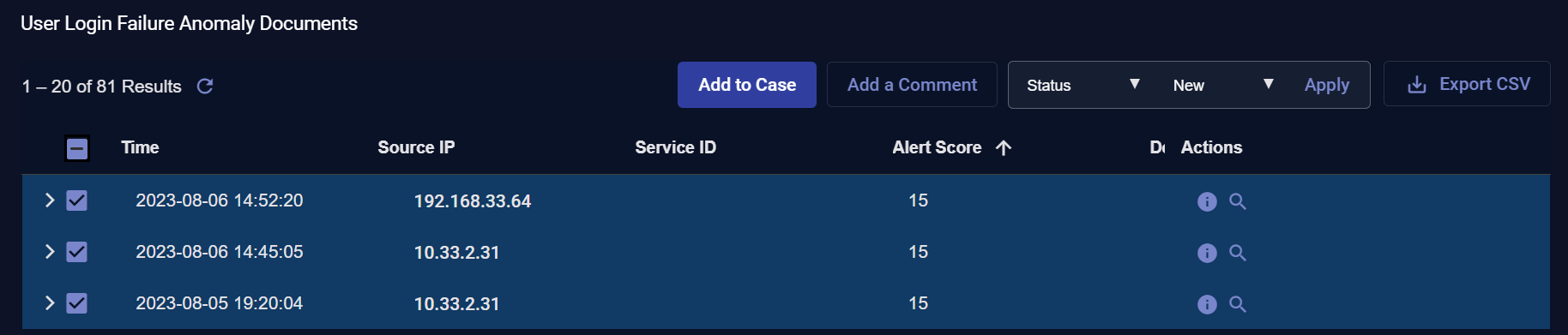 Tables listing alerts include an Add to Case button that lets you either create a new case based on the selected alerts or add them to an existing case.