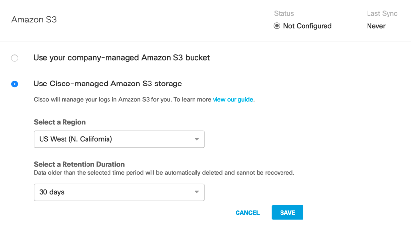 There are two options to configure Cisco Umbrella log management. Follow the guidance in the Cisco Umbrella documentation to Enable Logging to Your Own S3 Bucket or Enable Logging to a Cisco-managed S3 Bucket.