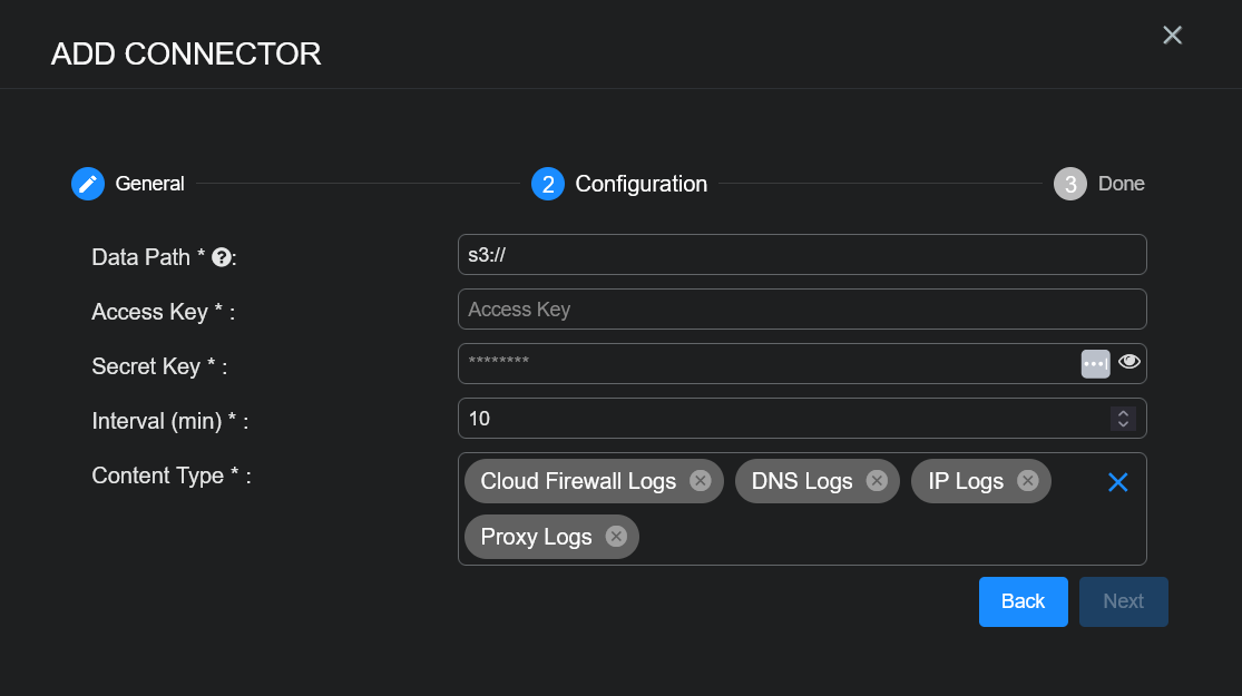 Choose the Content Type you would like to collect. The logs for Cloud Firewall Logs, DNS Logs, IP Logs, and Proxy Logs are supported.
