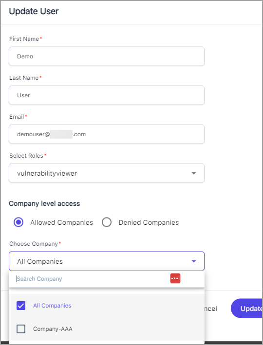 Enter the user information, such as First Name, Last Name, and Email, then select the roles, and choose the Company Level Access for that role.