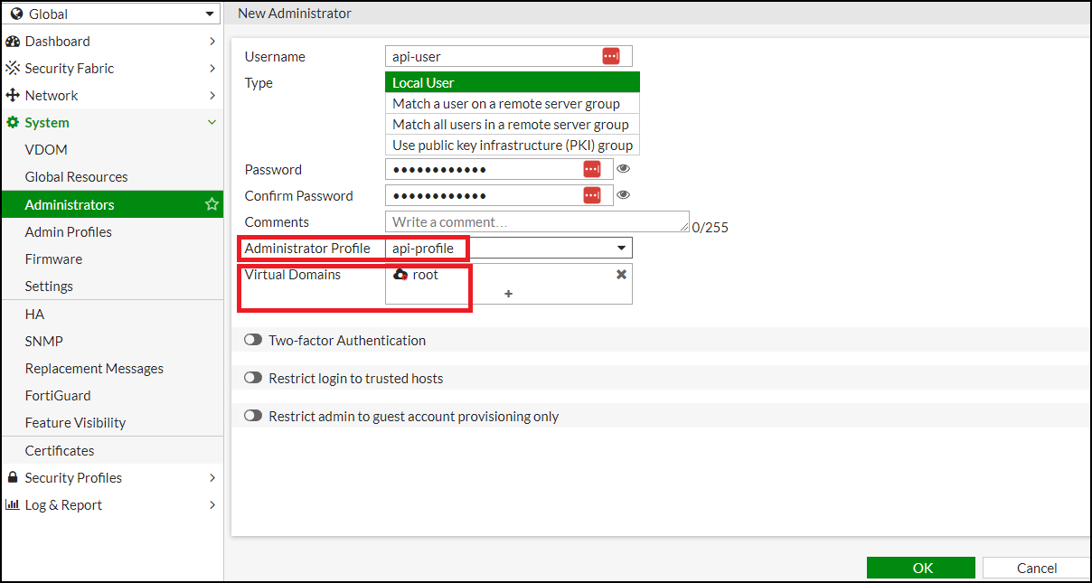 To create an API user for multiple VDOMs, follow the initial steps in Creating an API User for a Single VDOM: