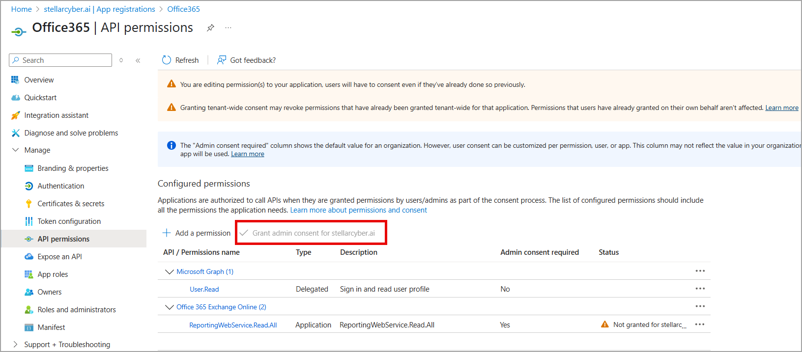 If you are the Office 365 super admin, grant the permissions. Select the checkmark to Grant admin consent for <tenant name>.