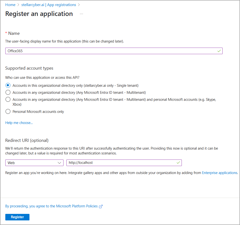 Choose a supported account type. For Single tenant, select Accounts in this organizational directory only.