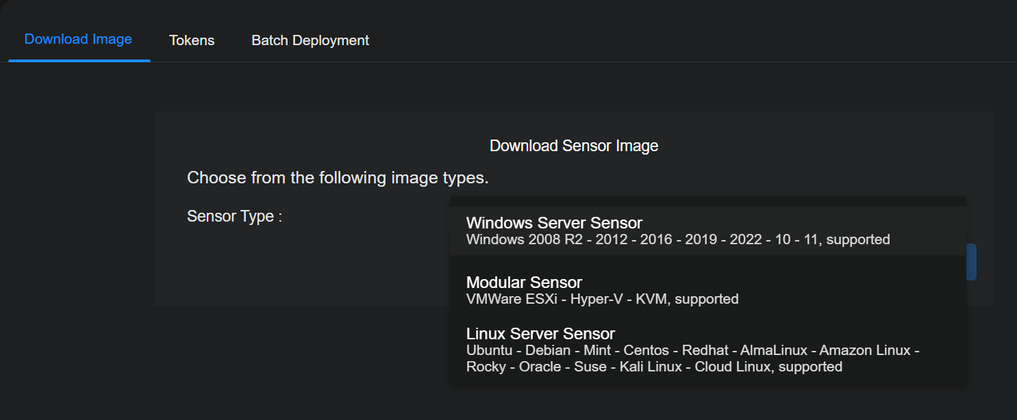 Download Image – Lets you download installation files for Linux Server Sensors, Windows Server Sensors, and Modular Sensors.