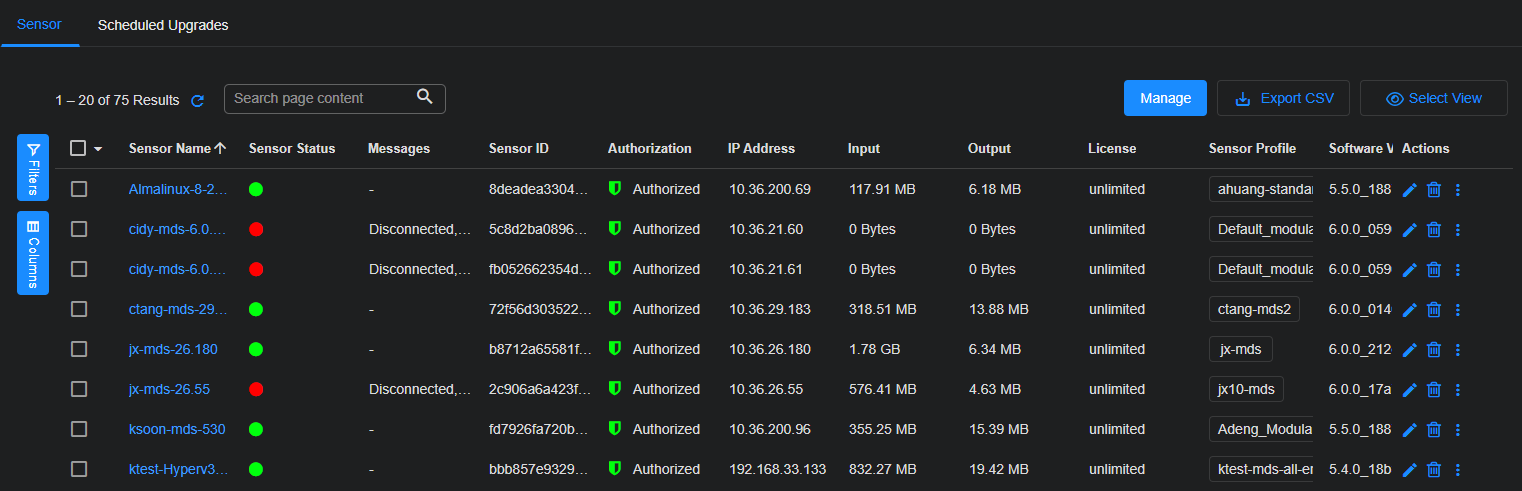 [ ] – Check box to select sensors to Upgrade, open CLI Access, or Manage. Buttons for these features appear above the table appear when one or more sensors are selected.
