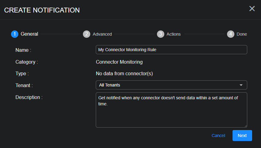 • Connector Monitoring – Get notifications when specified connectors haven't sent data over a given time interval so you can address issues in real time.