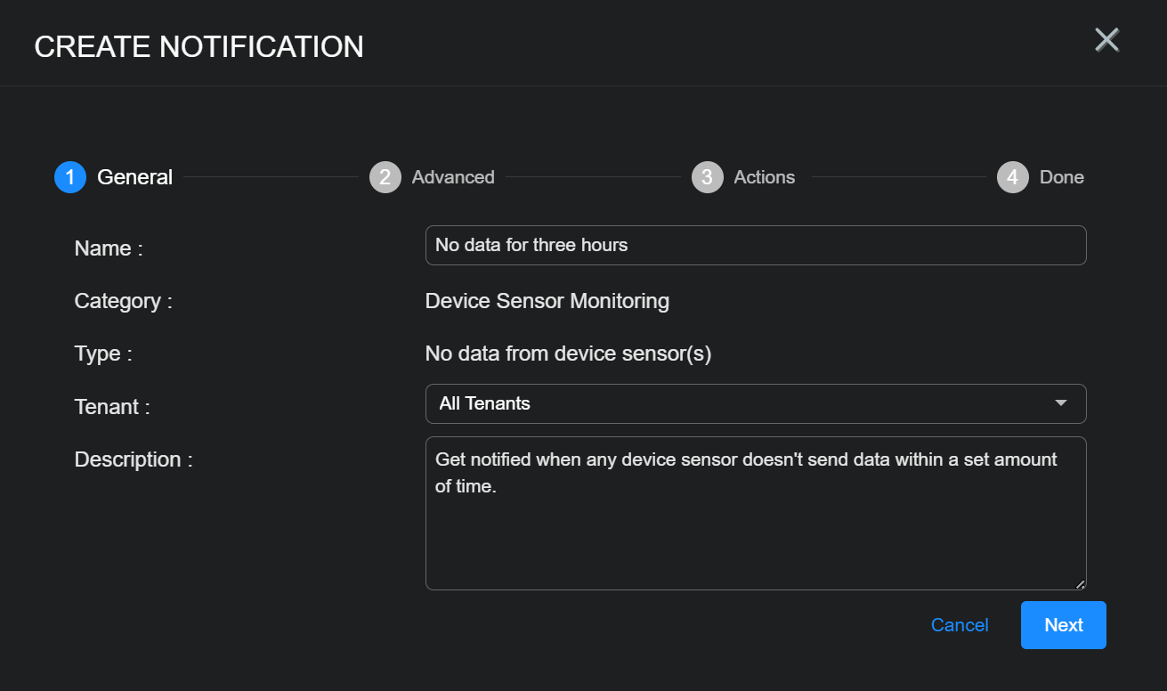 • Device Sensor Monitoring – Get notifications for different device sensor health issues (for example, no data or heartbeats).