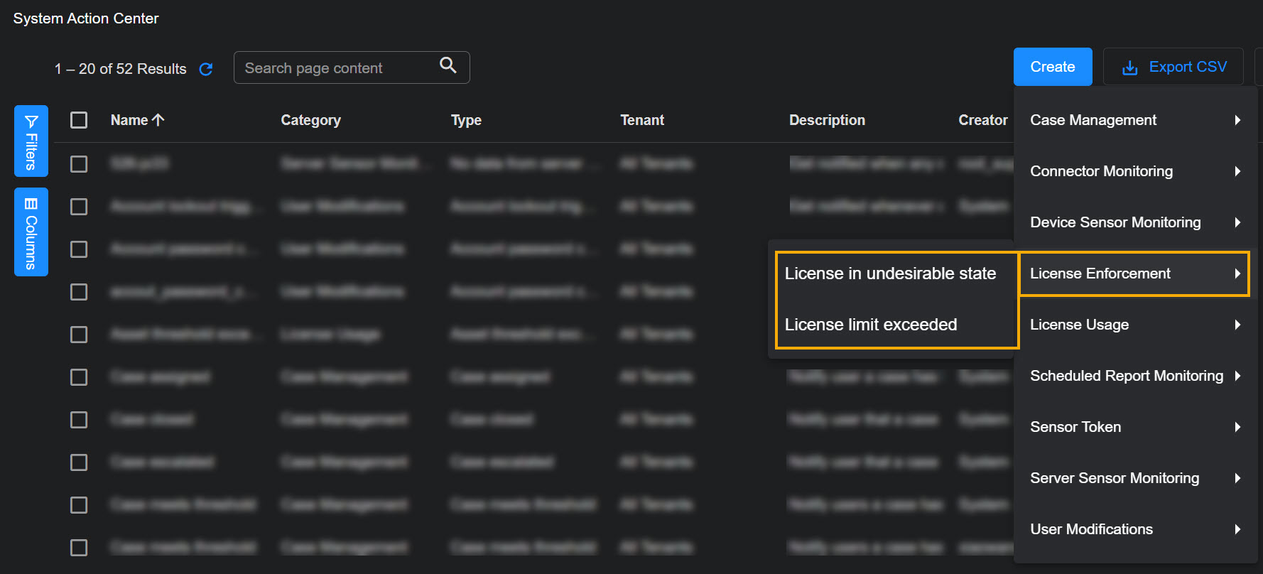 • Category – Rules are available in the following categories – Case Management, Connector Monitoring, Device Sensor Monitoring, License Enforcement, License Usage, , Scheduled Report Monitoring, Sensor Token, Server Sensor Monitoring, and User Modifications.