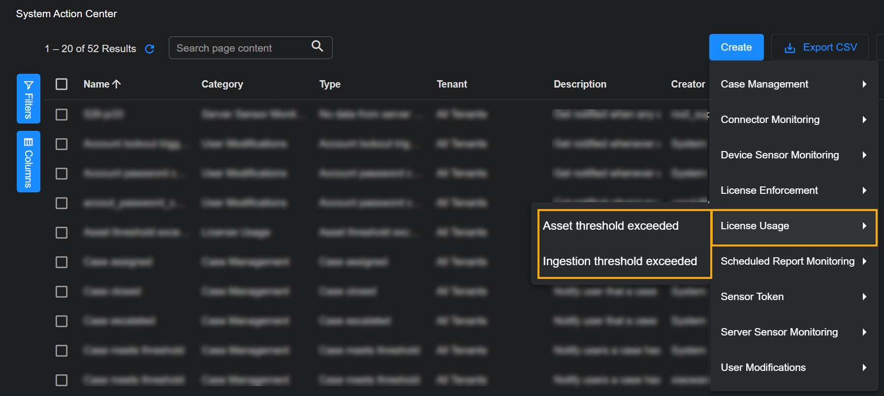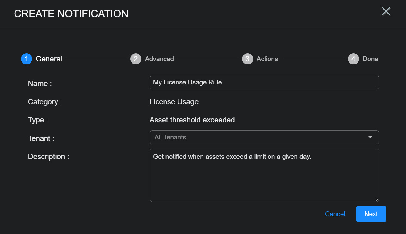 • License Usage – Get notifications when asset usage or ingestion usage exceeds specified thresholds.