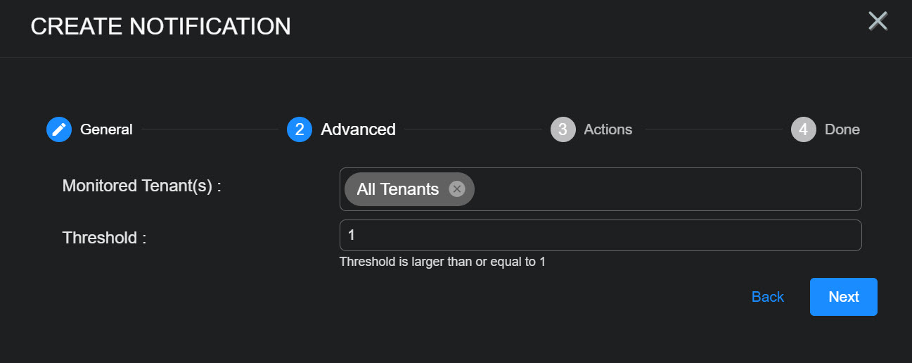 You use System | System Action Center to create and manage rules that specify when system notifications are triggered and where they are sent. Triggered notifications always appear in the Notification Center, available under the in the main toolbar. You can also configure notifications with both email and Slack actions to send messages to specified recipients, including both those defined in the System | Recipients page and those you specify manually on demand.