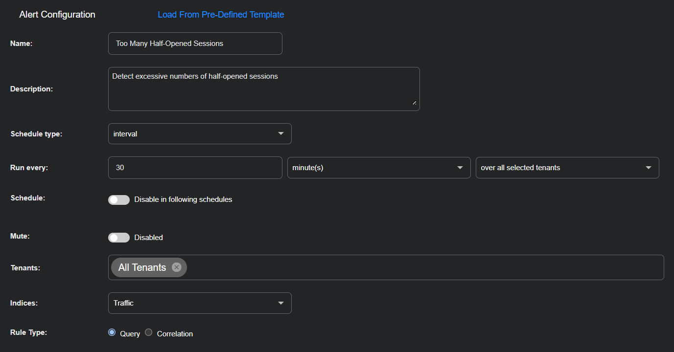 Set up the alert to run at regular intervals so that the playbook can consistently identify devices exhibiting suspicious connection behavior. By querying for half-opened sessions every 30 minutes, you ensure timely detection of anomalies as they emerge in the network traffic.